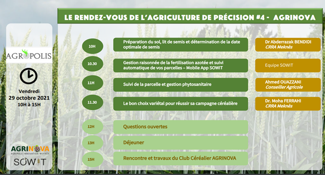 Dans ce contexte, la journée d’information « Réussir la campagne céréalière dans un contexte d’incertitude : Enjeux économiques, climatiques et opérationnels de la campagne céréalière » a été organisée au Qualipôle alimentation de Meknès, 29/10/2021 (10H) à l’initiative de l’Association Agripole Innovation Meknès (AGRINOVA), la société SOWIT leader en agriculture de précision, l’INRA (CRRA Meknès) , et la Direction Régionale de l’Agriculture Fès-Meknès.